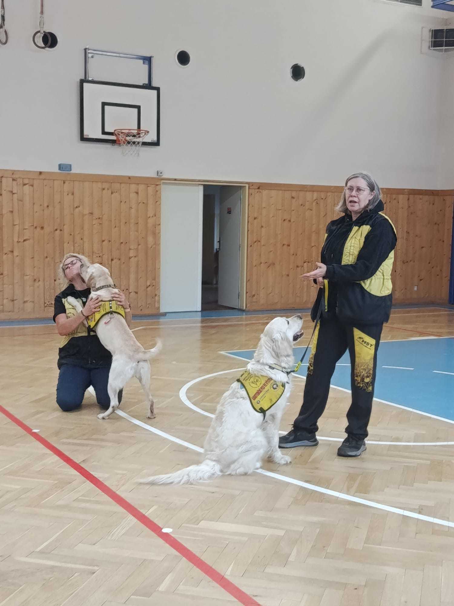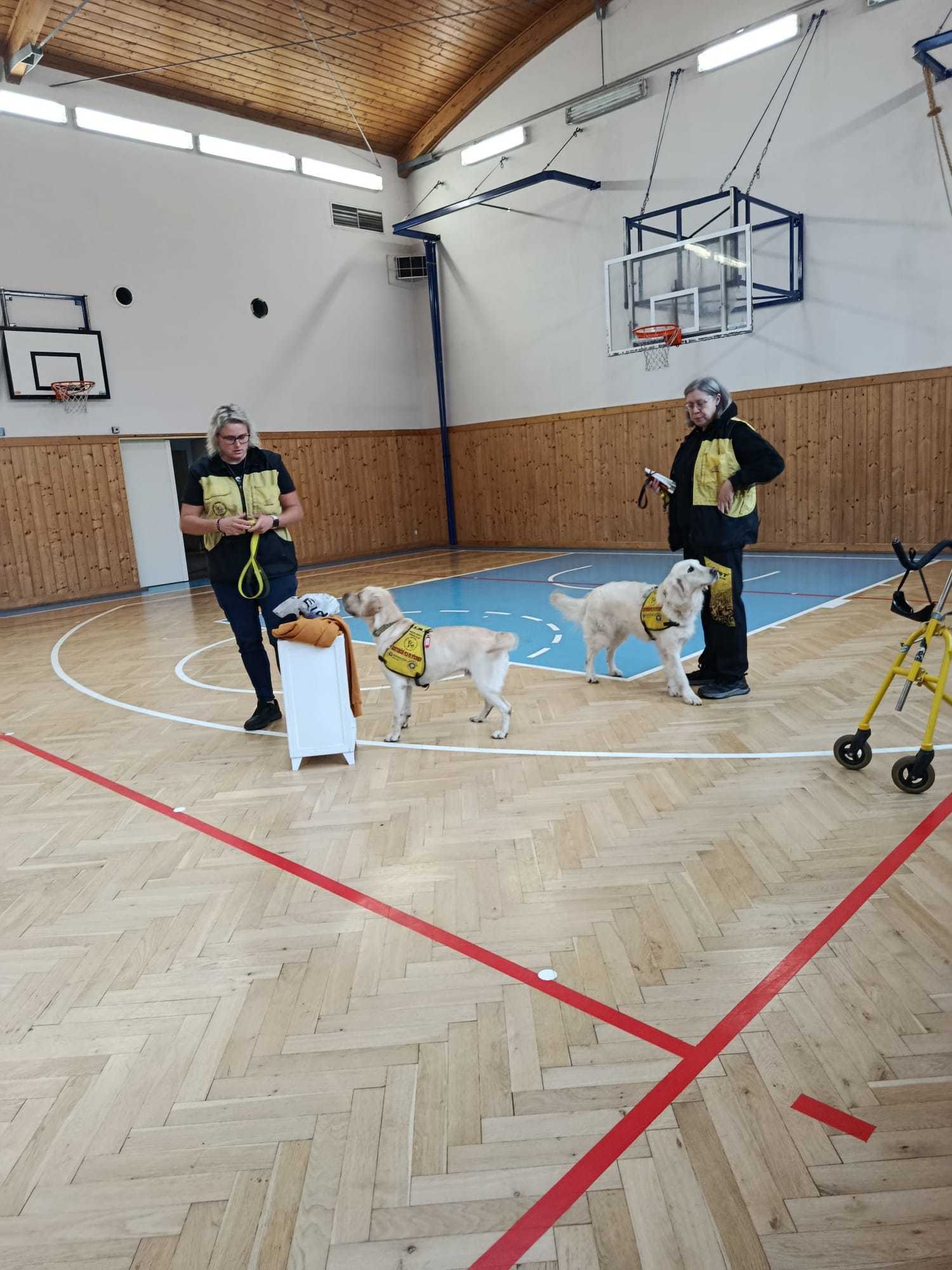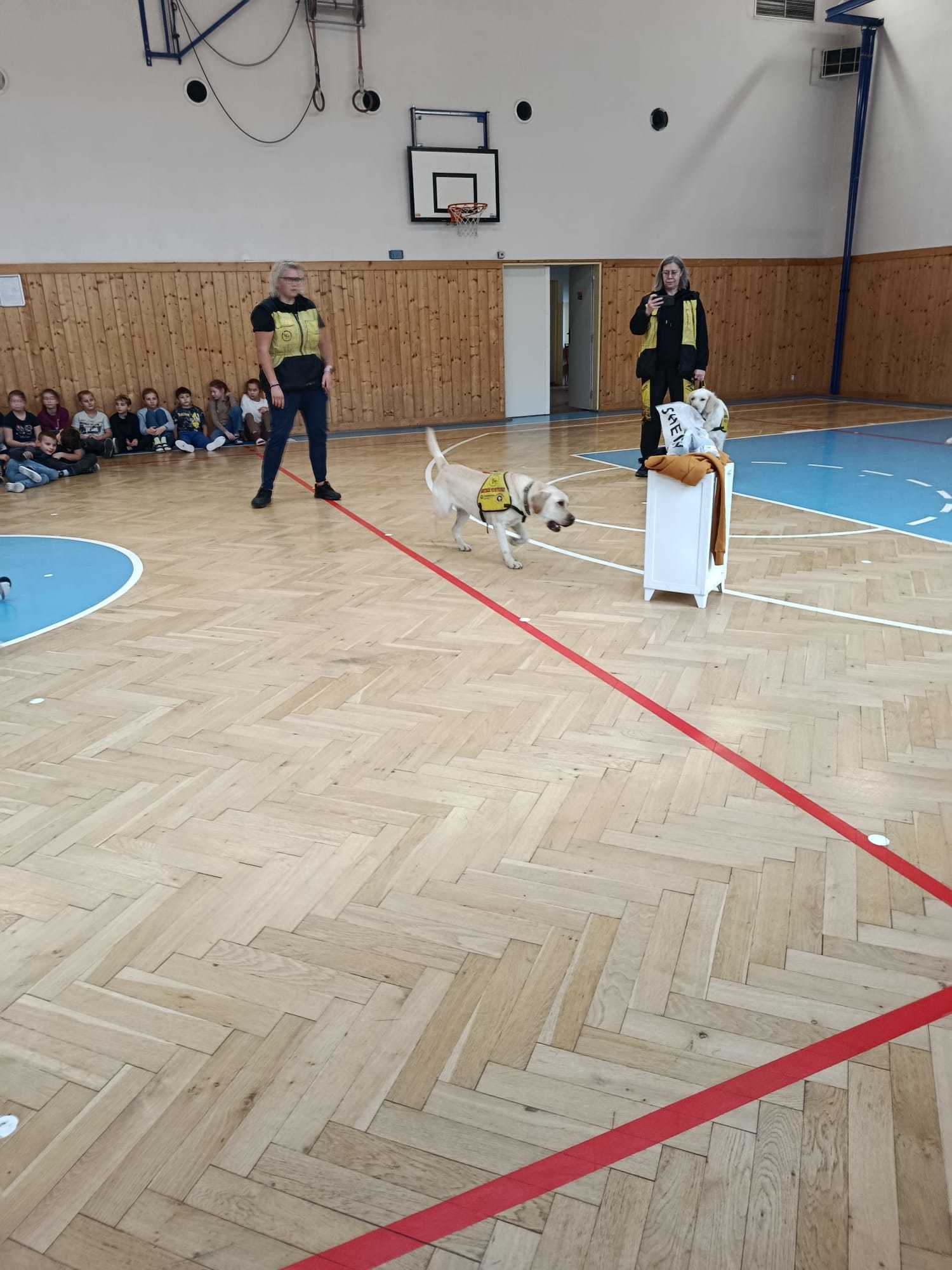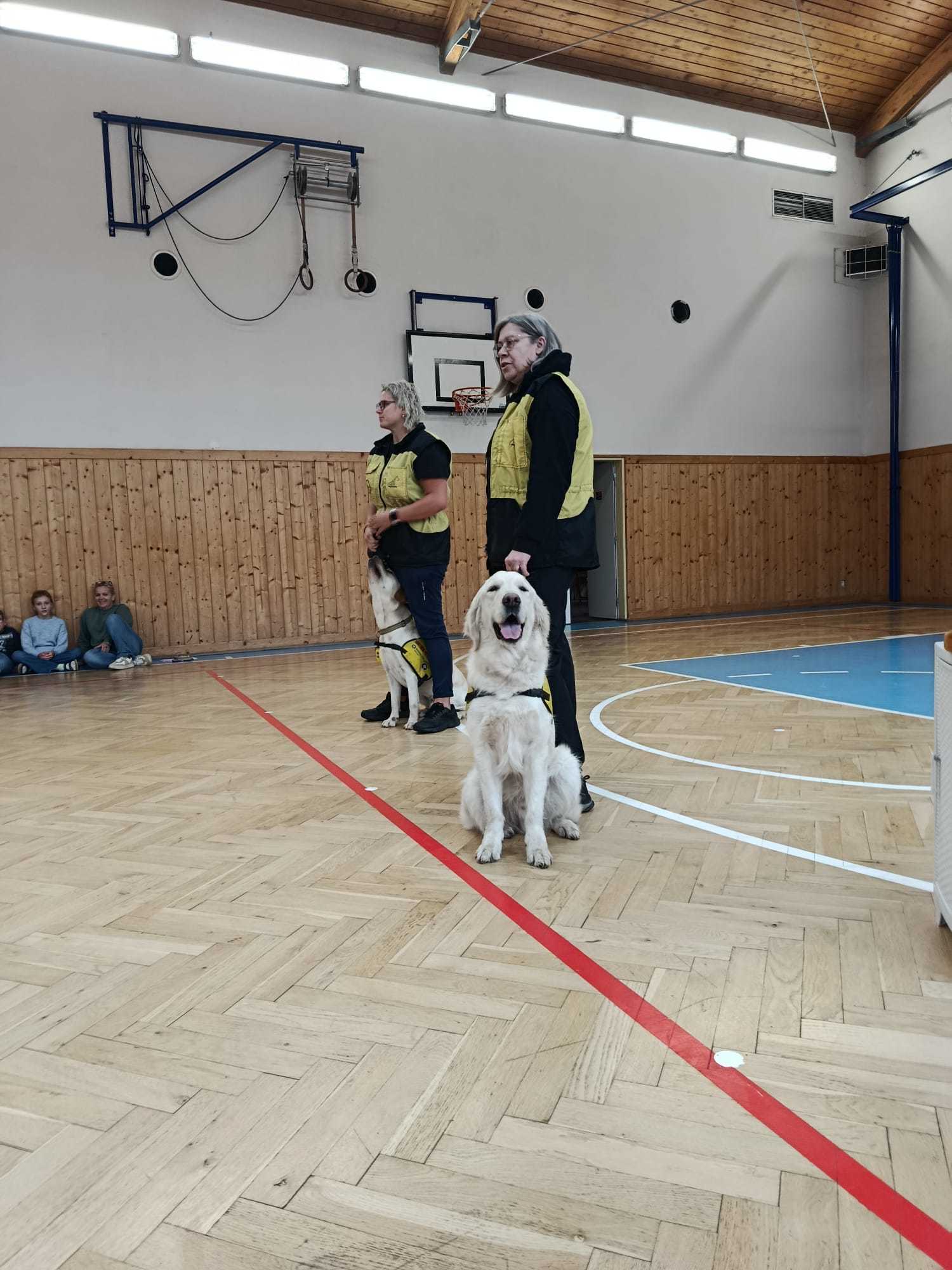 Na začátku trenérky psů představily své svěřence, které jsou momentálně ve výcviku. Také nás seznámily s tím, co tato práce obnáší, jak je financována, pro jaké lidi lze pejsky vycvičit - například pro nevidomé, neslyšící, pro lidi s autismem, ale také pro lidi, kteří se bojí ostatních lidí. Každý pes se cvičí dle potřeby klienta. Dozvěděli jsme se jak celý tento proces, od výcviku až po předání, funguje.