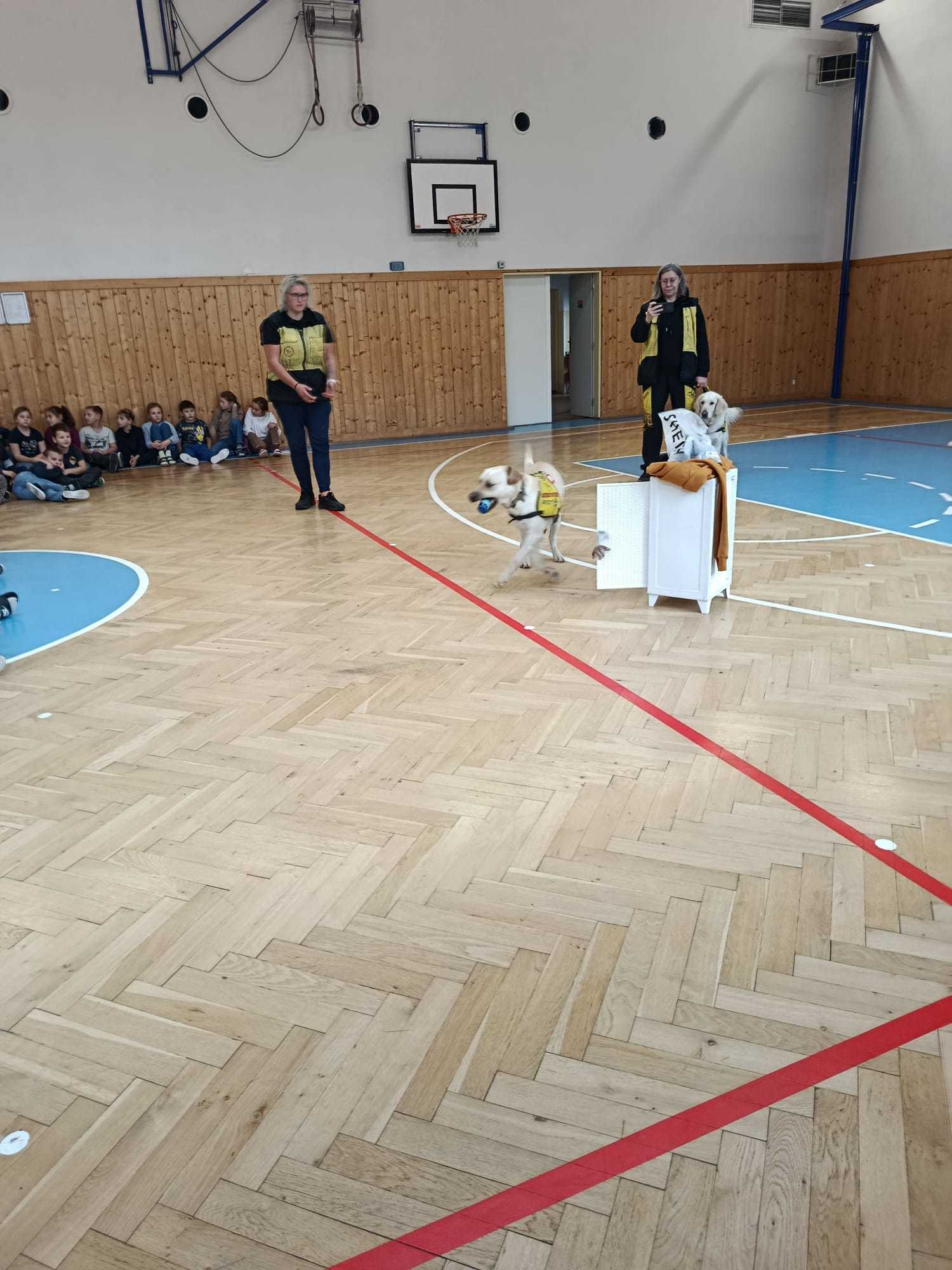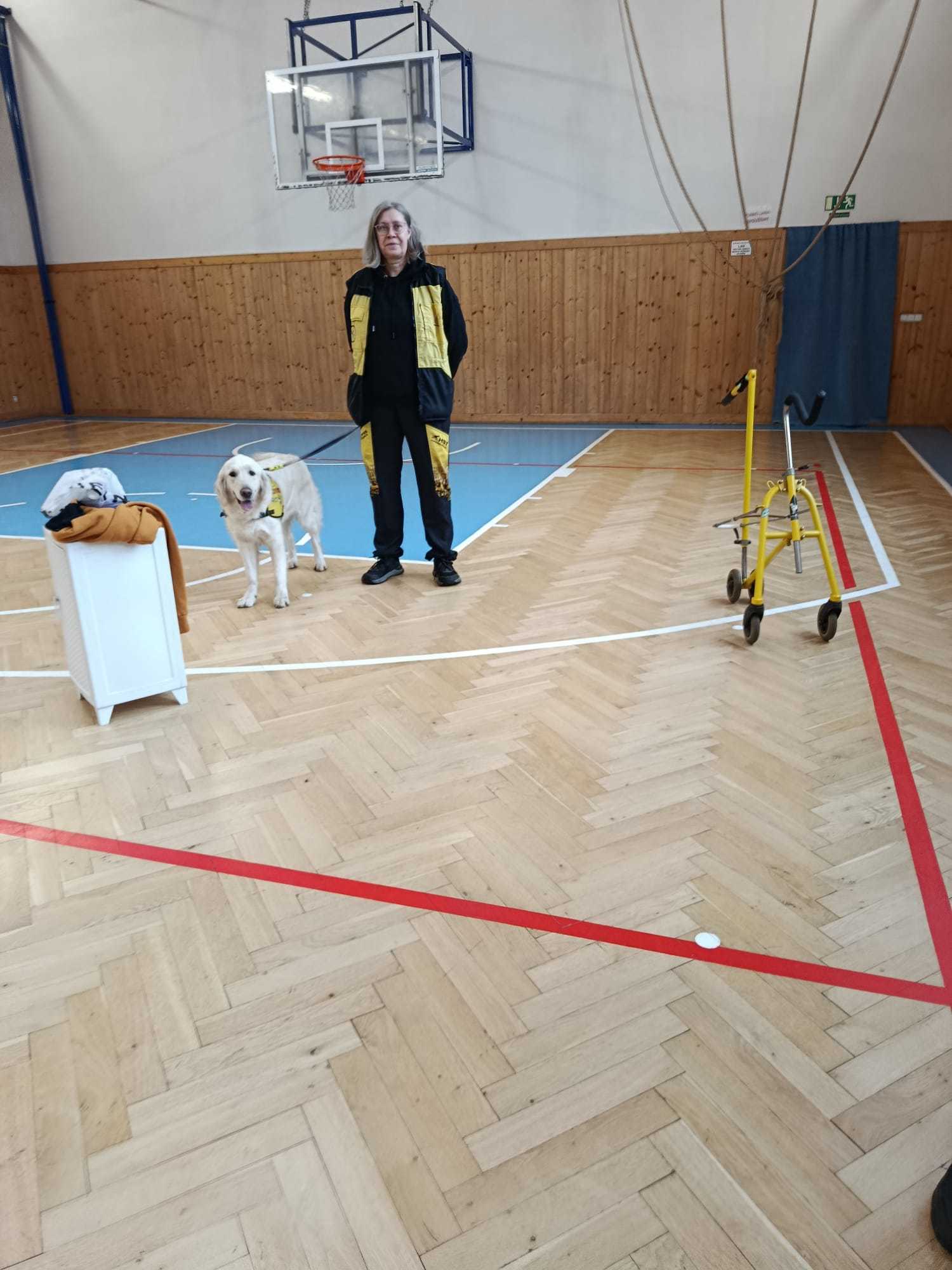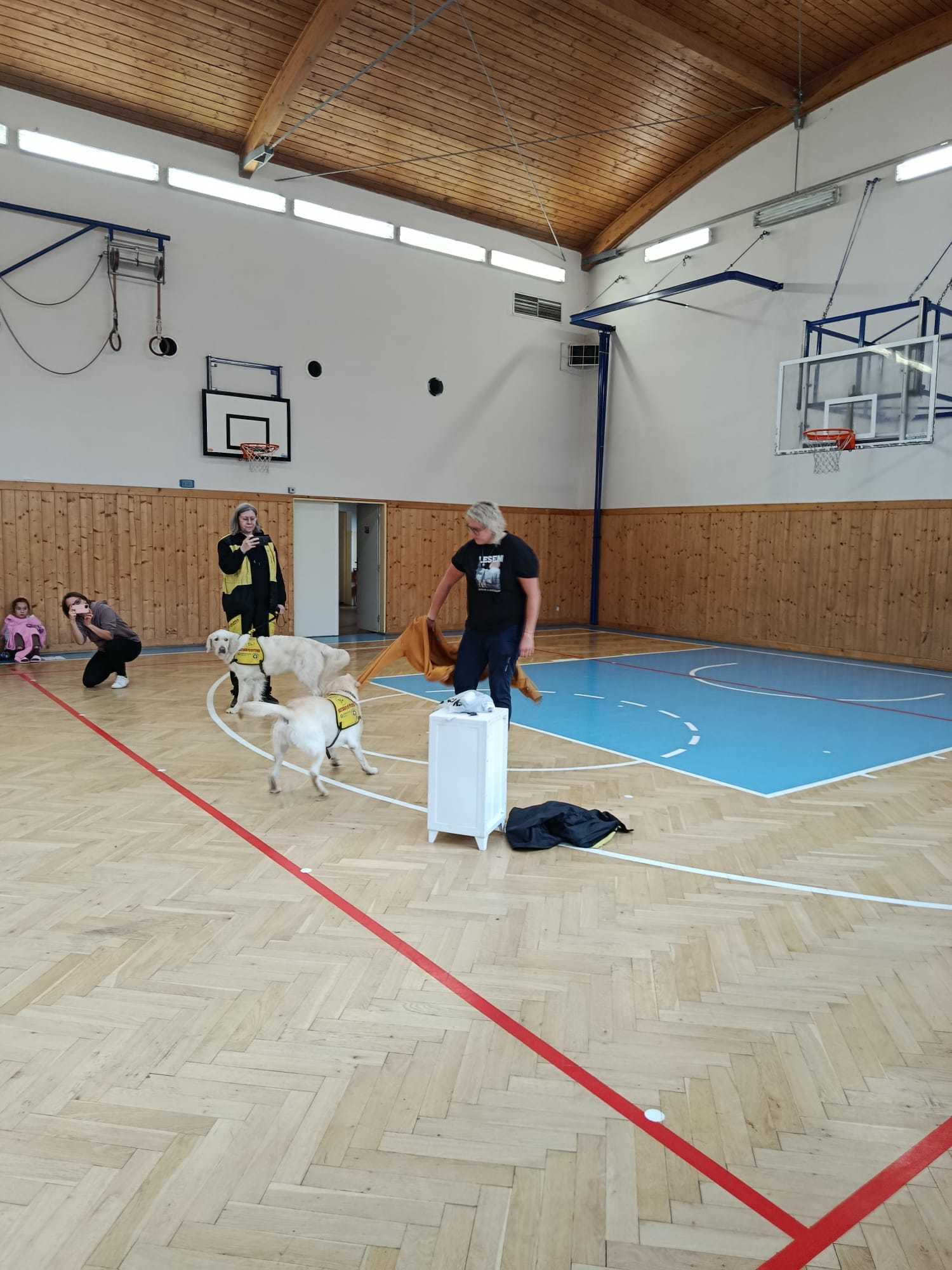 Po krátké besedě následovala ukázka dovedností dvou pejsků. Předvedli nám, jak umí sebrat předměty ze země, otevřít skříňku, svléknout mikinu, rukavice.