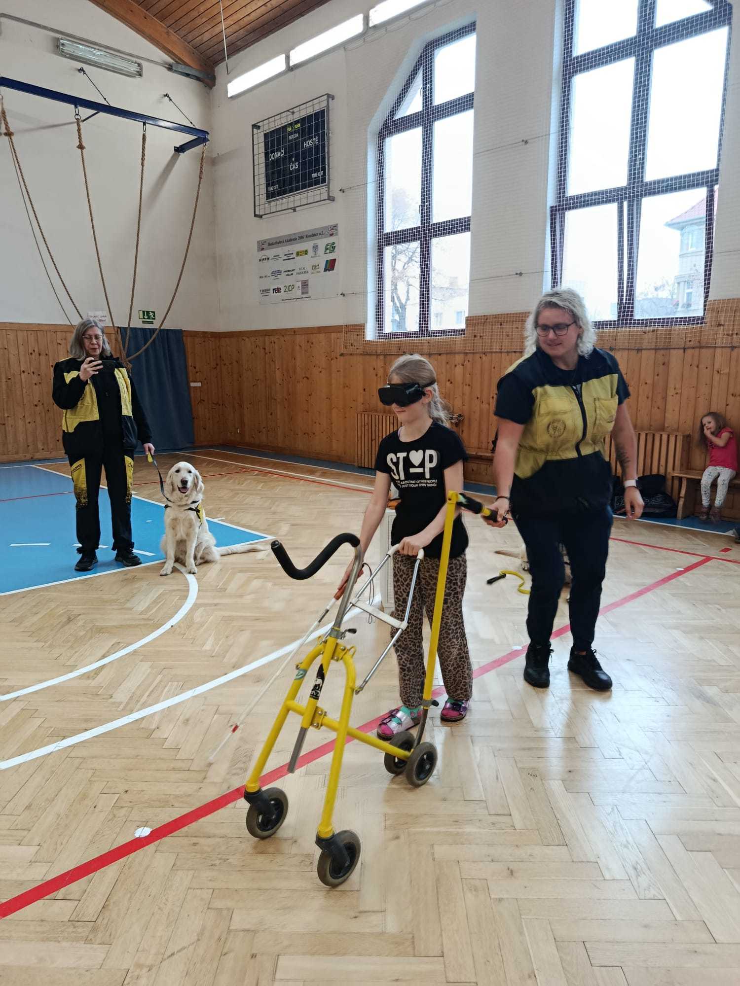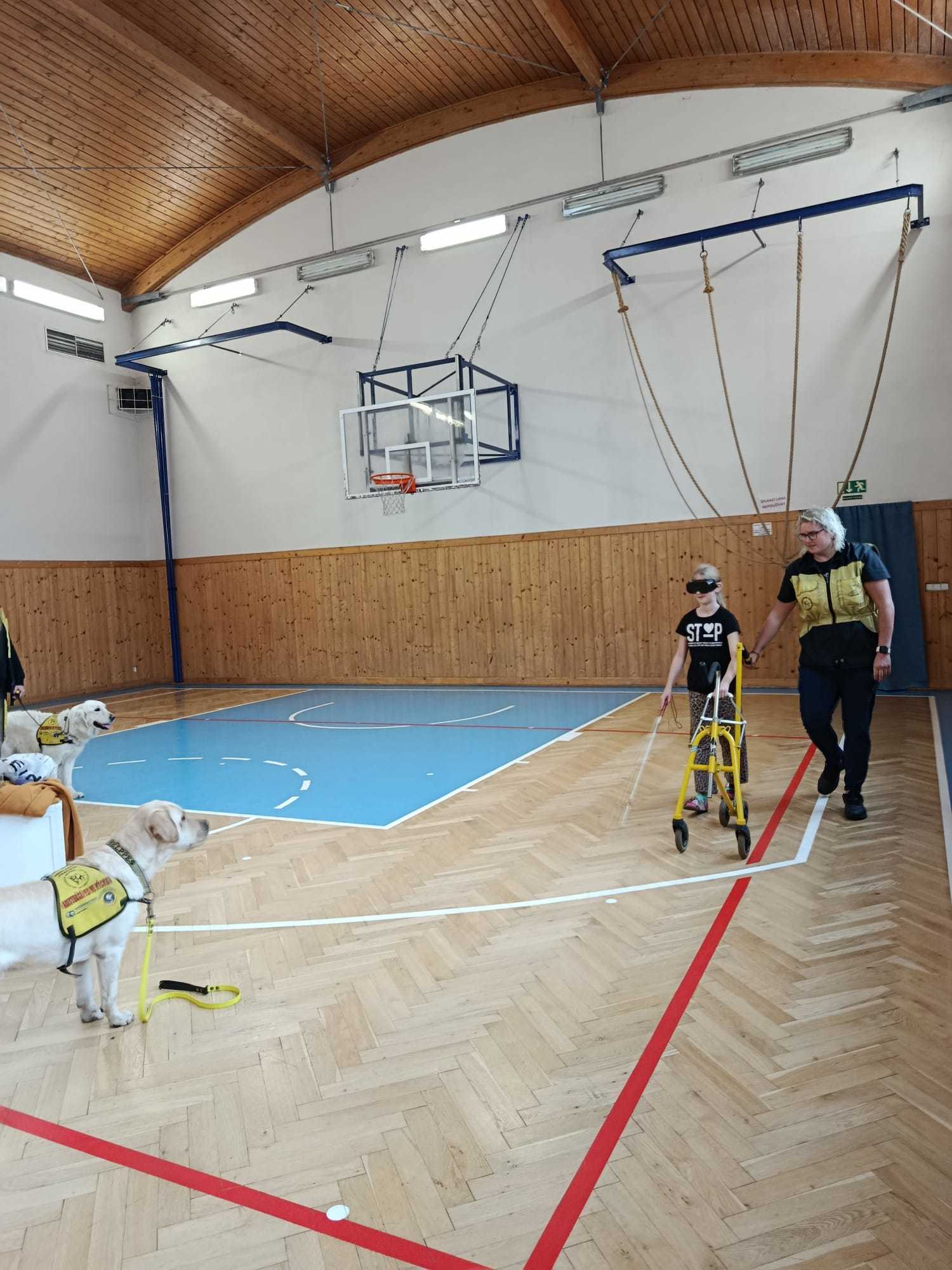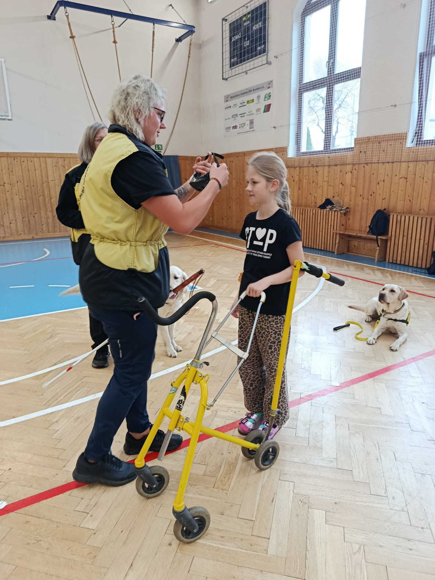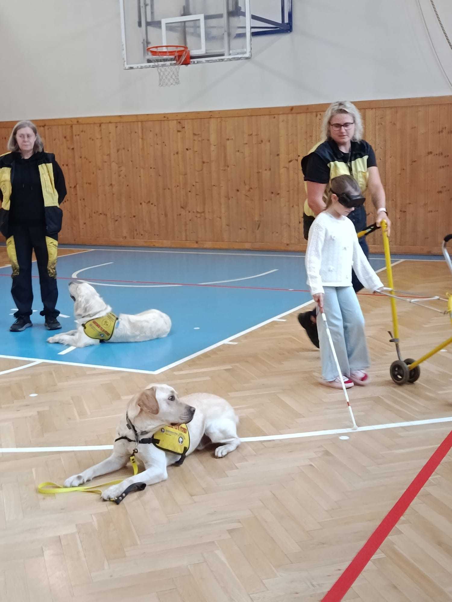 Dále si děti mohly vyzkoušet chůzi s asistenční pomůckou, na které se učí klienti se zrakovým postižením vést svého psa.