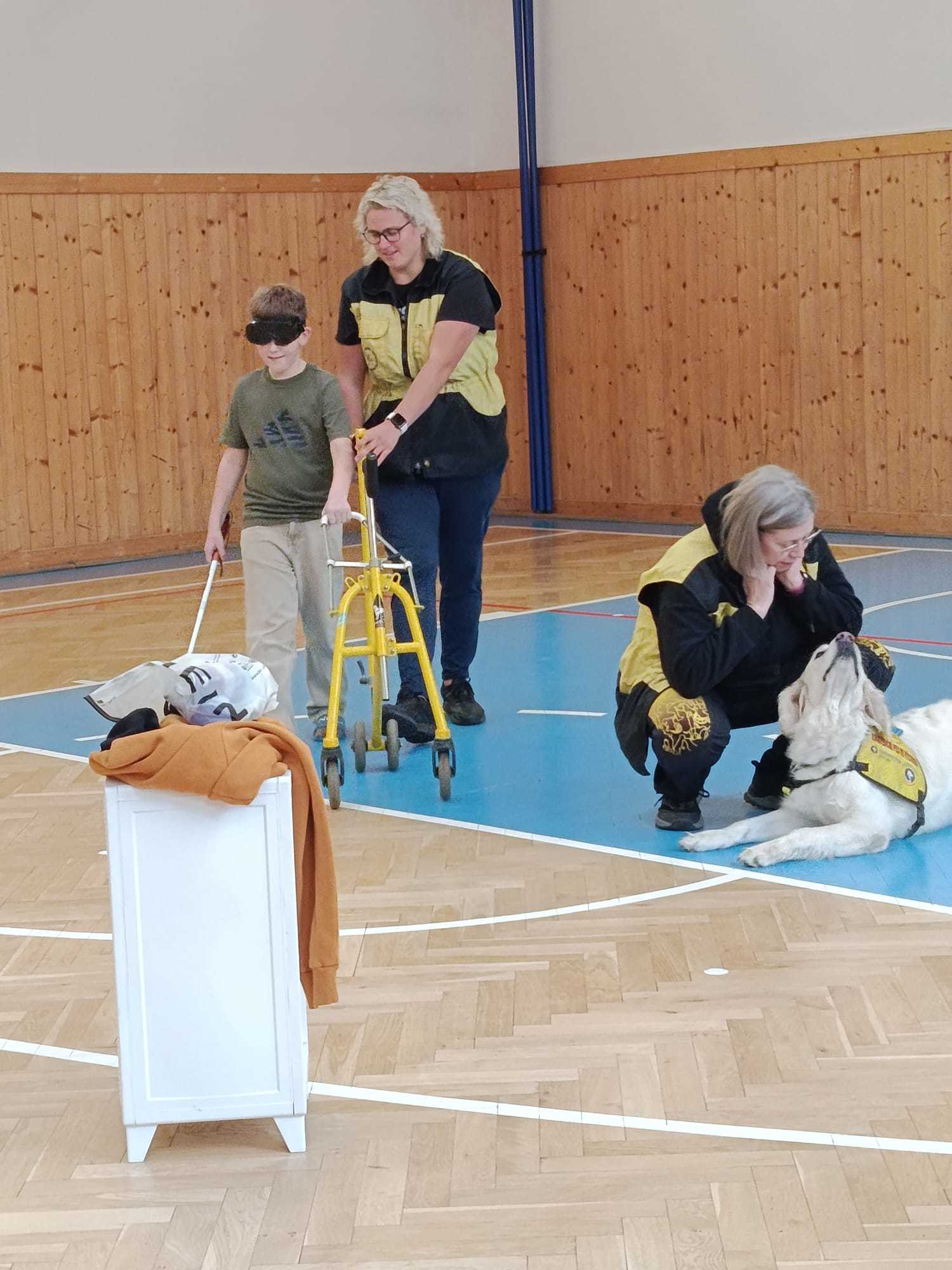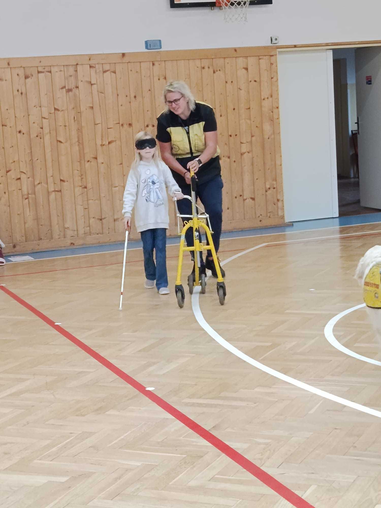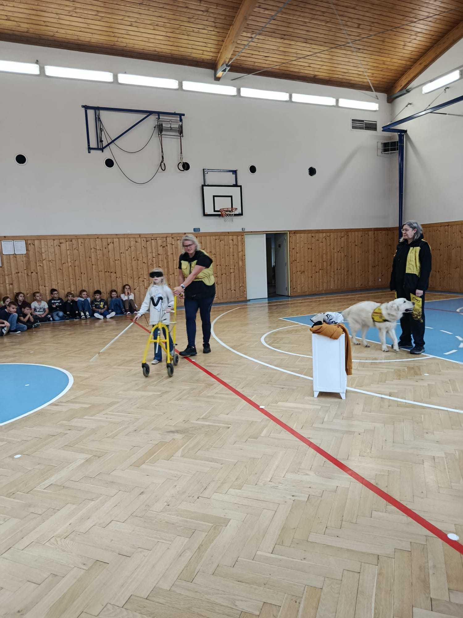 Dále si děti mohly vyzkoušet chůzi s asistenční pomůckou, na které se učí klienti se zrakovým postižením vést svého psa.