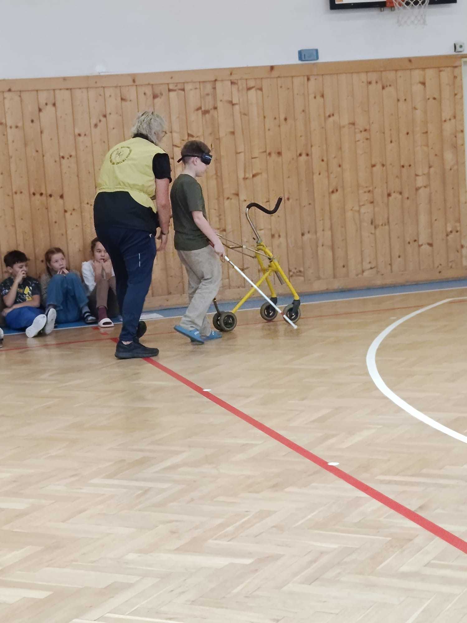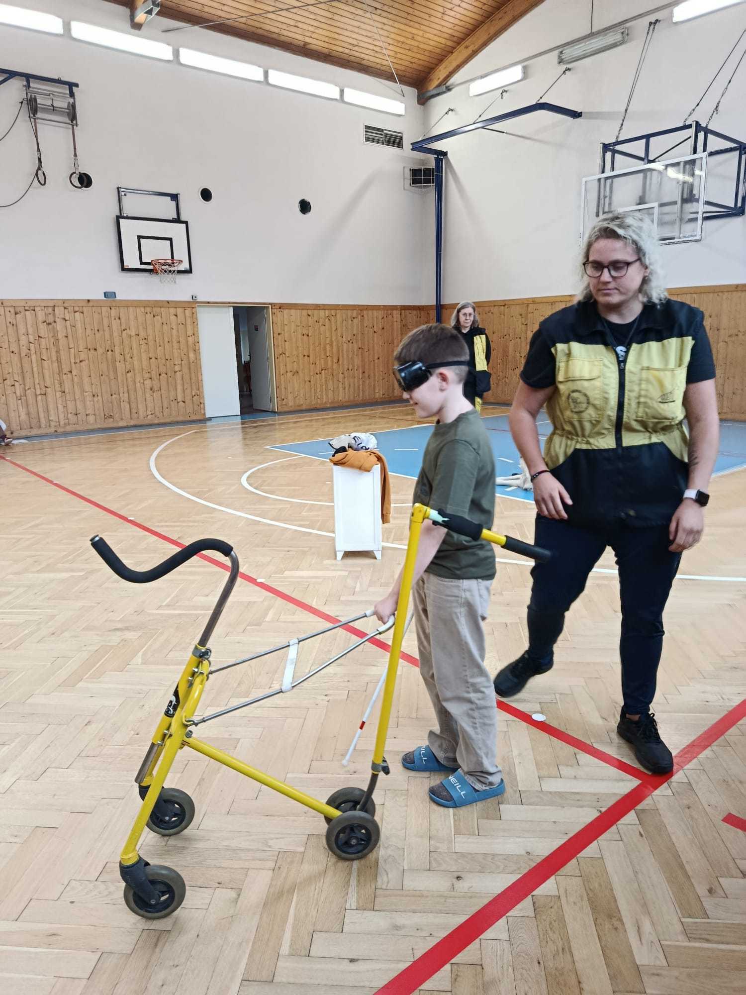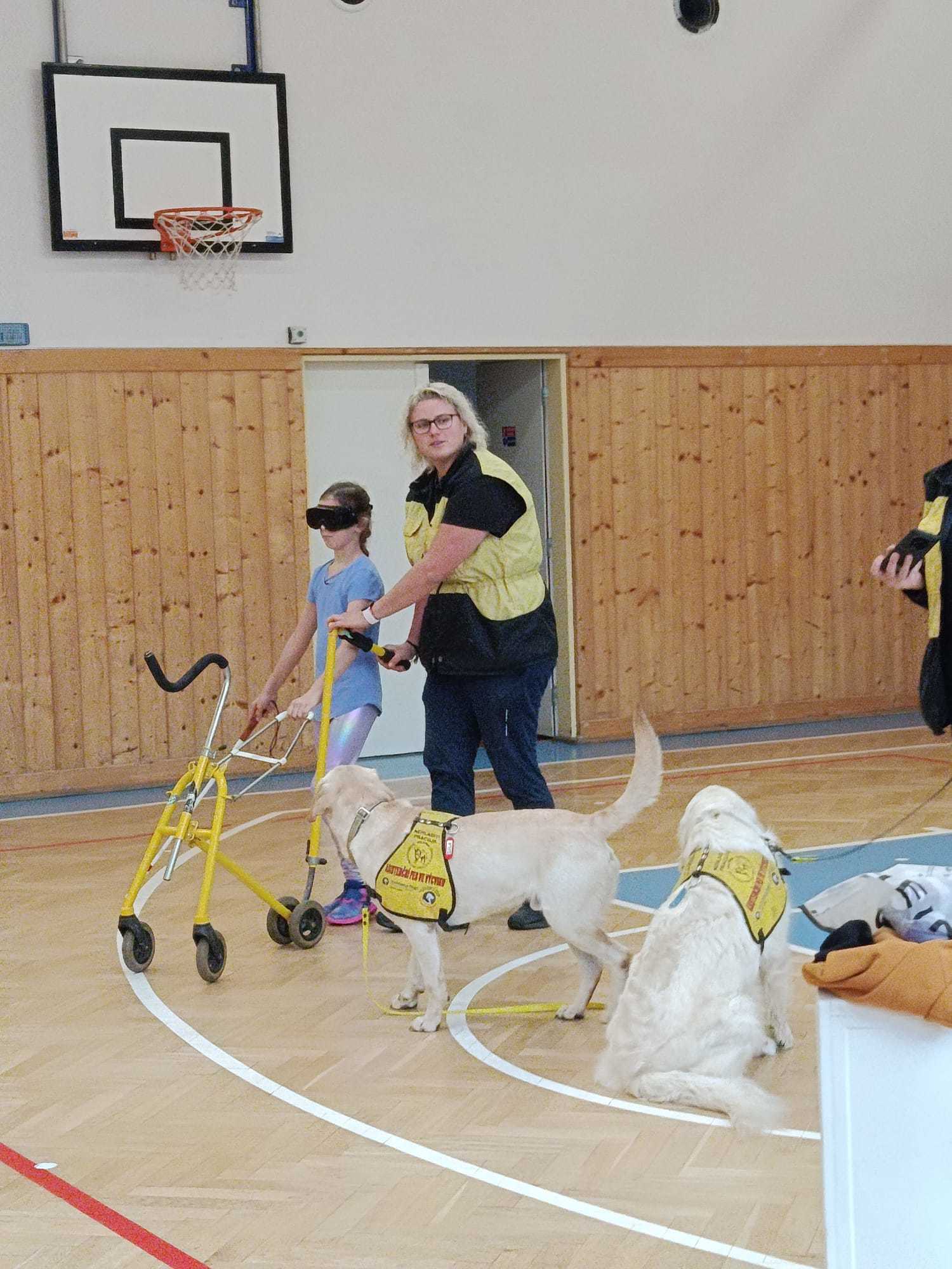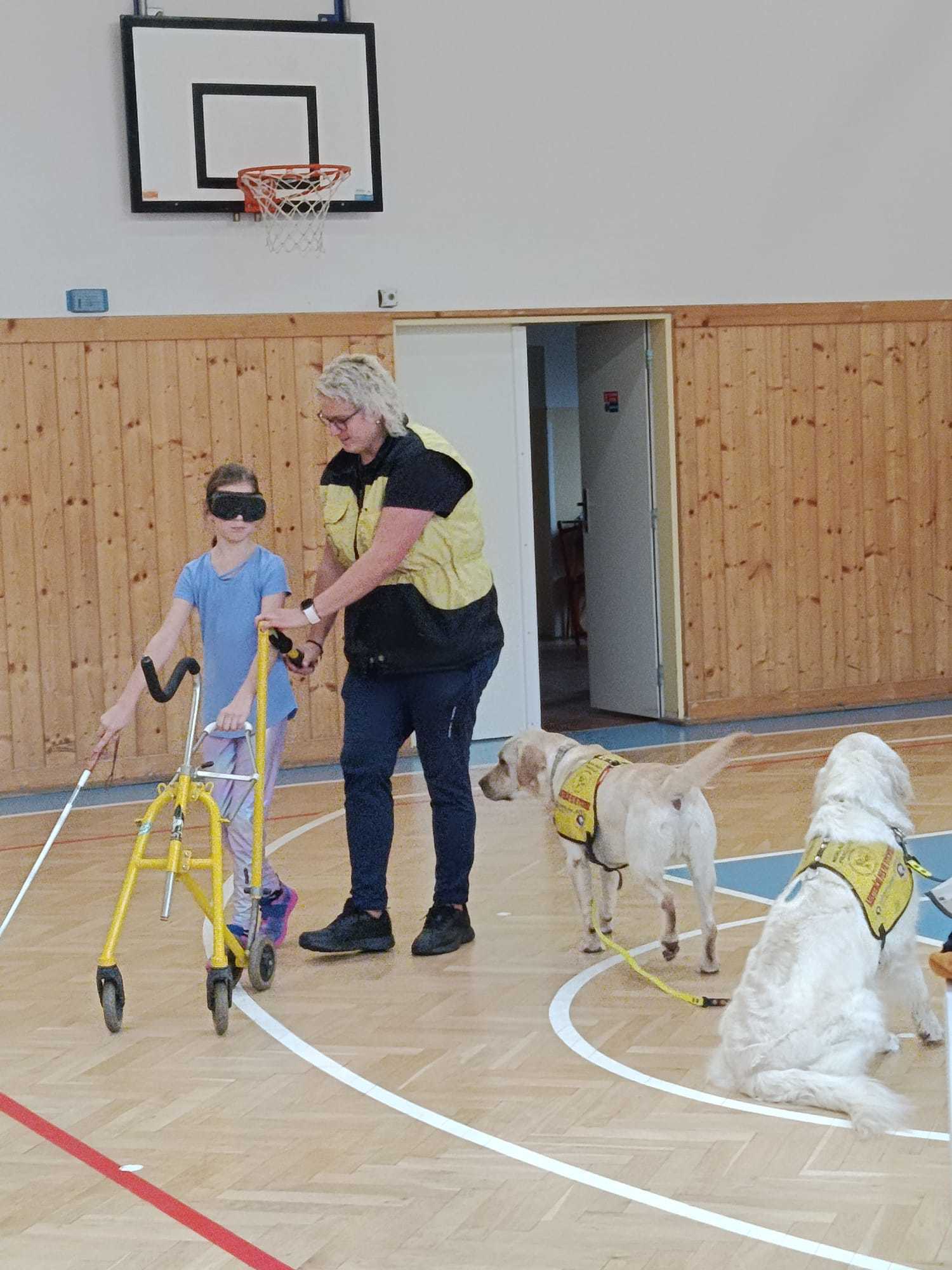 Dále si děti mohly vyzkoušet chůzi s asistenční pomůckou, na které se učí klienti se zrakovým postižením vést svého psa.